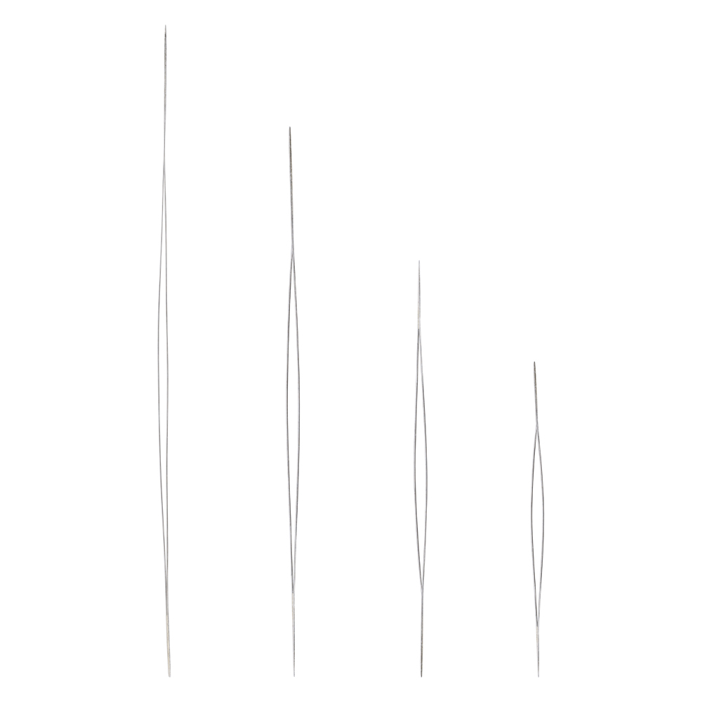 Набор из 4 гибких тонких игл с большим складным ушком. Состоят из двух спаянных игл, которые образуют большое ушко. Такие иглы предназначены для облегчения нанизывания бисера и бусин на тонкую нить, леску, спандекс, резинку и т.д.